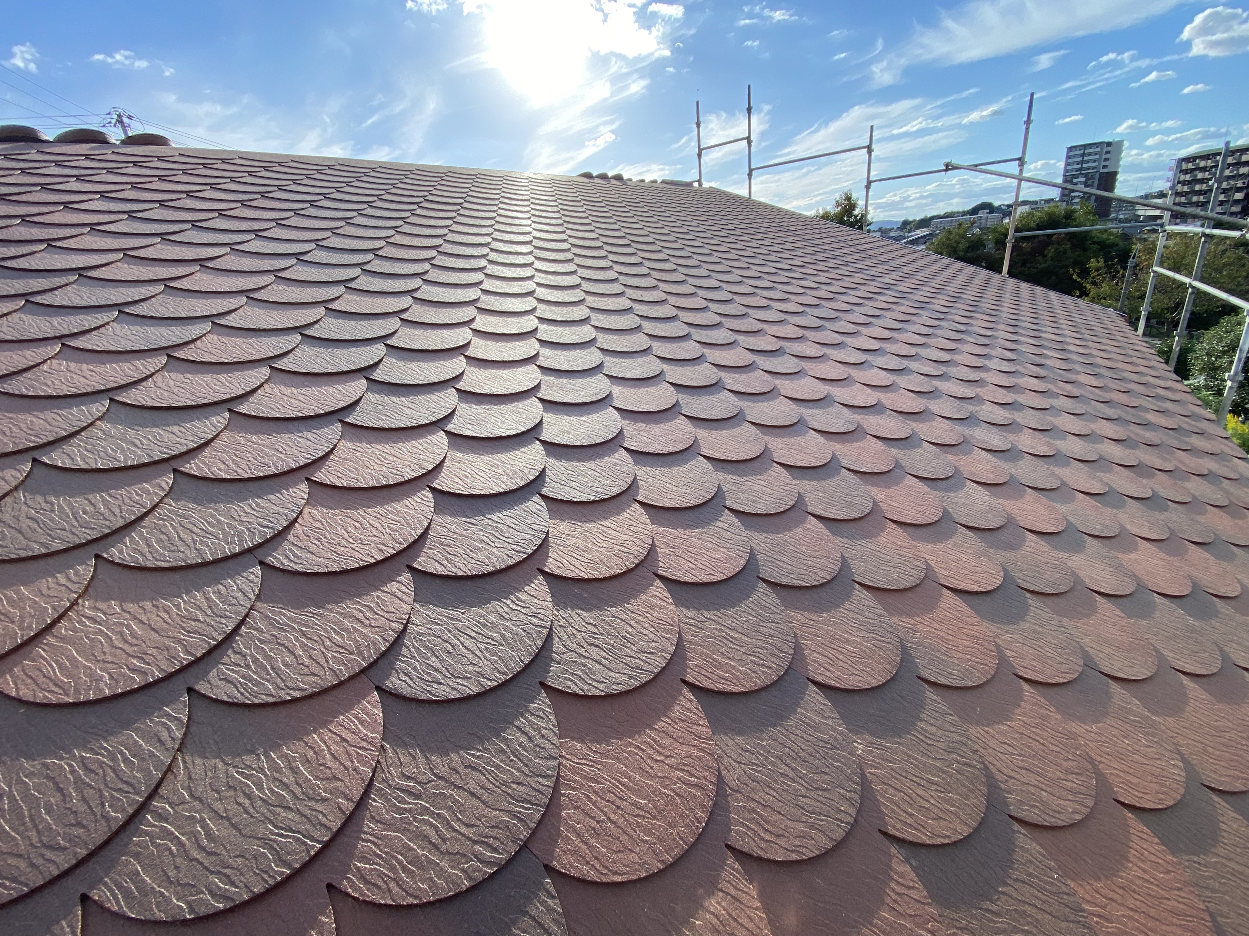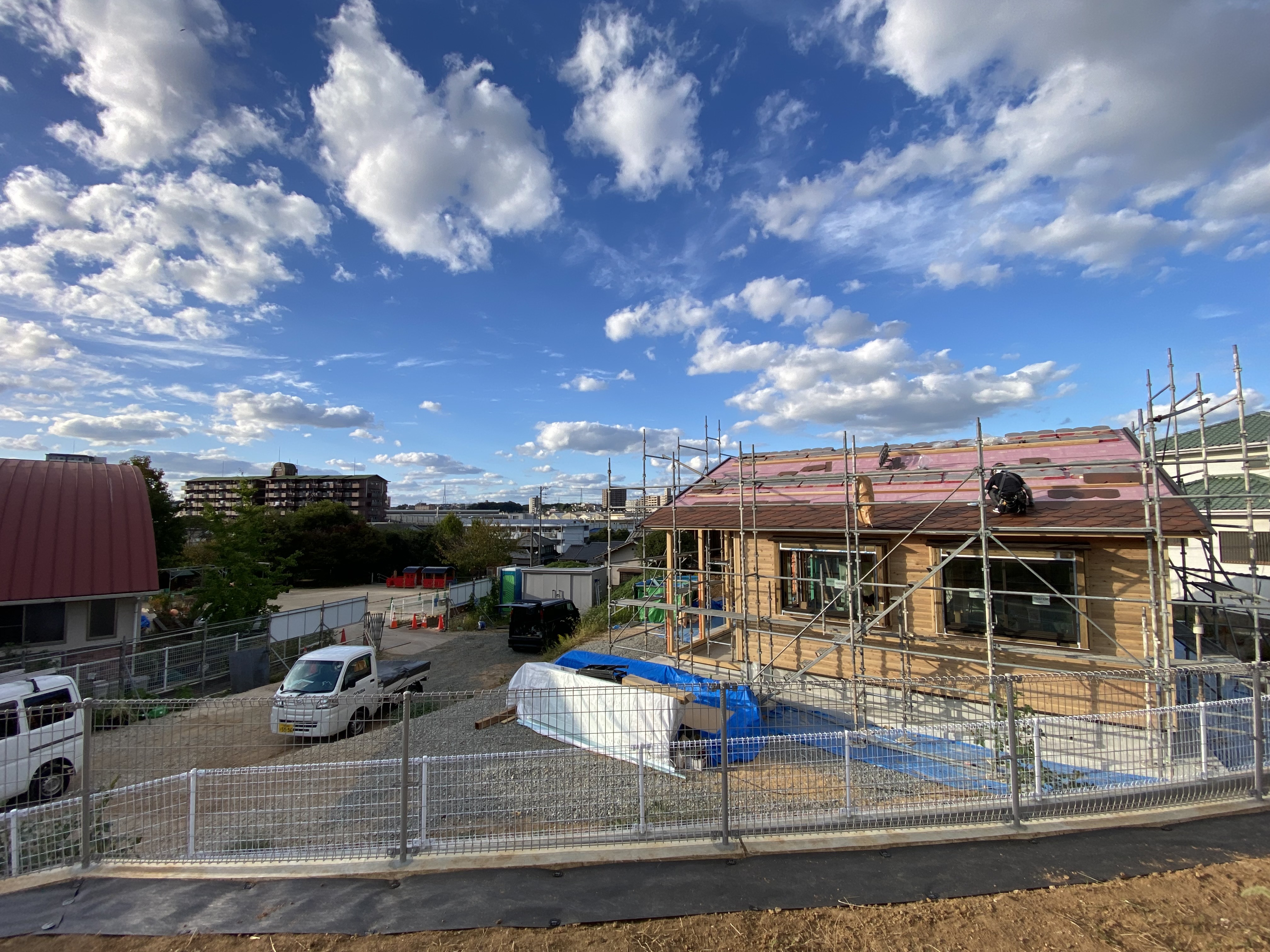ログ風の外装やかわいい屋根も仕上がり足場撤去を急ぎます。